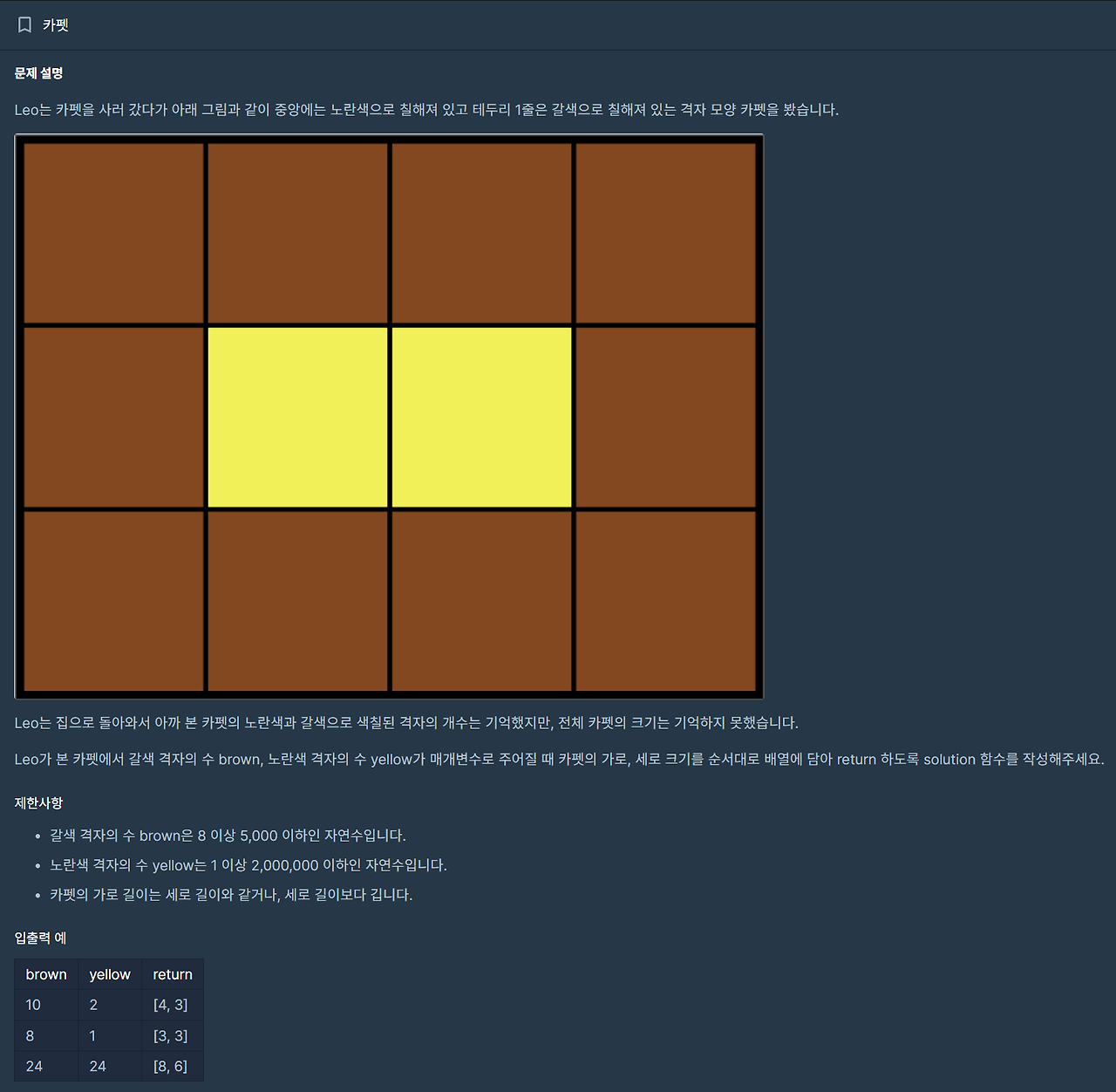 # 갈색과 노란색의 갯수만으로 카펫의 크기를 구해야한다.