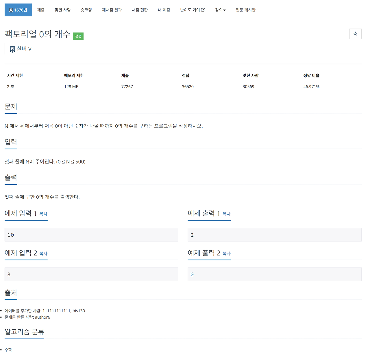 # N!에서 뒤에서부터 처음 0이 아닌 숫작 ㅏ나올 때까지 0의 갯수를 구하는 프로그램을 작성하시오.